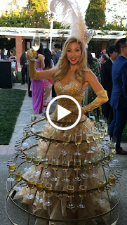 Strolling  Human Tables, Rolling Champagne Dresses, lots of bubbly and happy guests.
